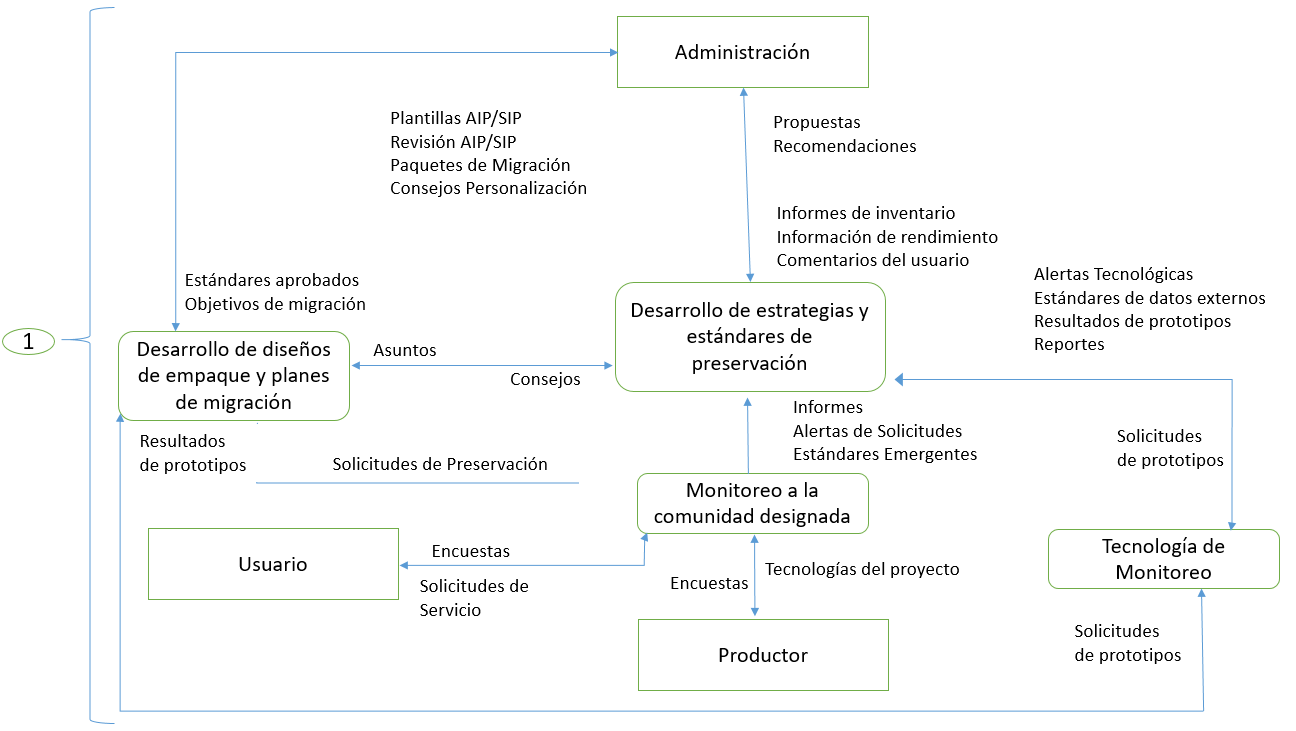 - Administración de la información de preservación. Debe de ayudar con la gestión de la información de los materiales digitales y su preservación, y debe de ayudar con la administración de los metadatos, la planificación y estrategias a usar en la preservación, monitorear la integridad de los materiales y las políticas de acceso.