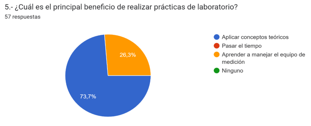 Respecto a las expectativas de aprendizaje, el 49.1% de los estudiantes señalaron que la principal motivación para realizar prácticas era aplicar la teoría aprendida, mientras que el 42.1% destacó el desarrollo de habilidades técnicas. Además, el 8.8% de los encuestados identificó la mejora en la resolución de problemas como un objetivo importante. Estos datos demuestran que los estudiantes valoran el laboratorio como un espacio para consolidar el conocimiento teórico a través de la práctica.
